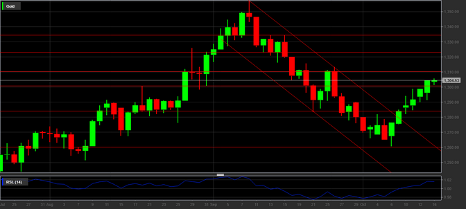 Il prezzo dell’oro sembra non fermarsi, il suo valore ha superato 1300$ e continua la sua performance rialzista dal 6 ottobre. Prossimo target sarà 1310$ l’oncia. Determinanti le vendite al dettaglio americane, che hanno dato un grande slancio all’oro nel giro di 15 minuti lo scorso venerdì 13 ottobre.