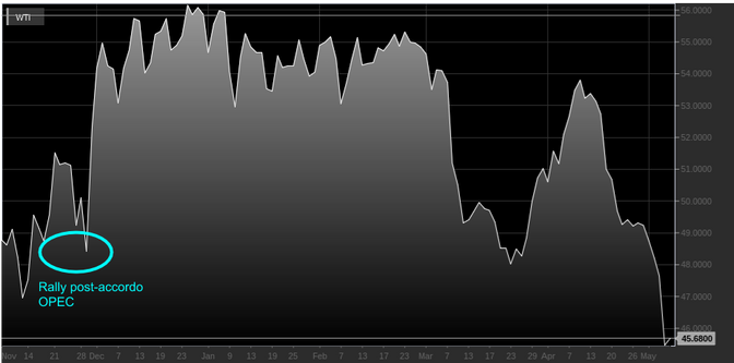 Come forse qualcuno aveva già previsto, il prezzo del petrolio è letteralmente crollato e si è inabissato ben sotto quota 50 dollari a barile, cancellando completamente tutti i guadagni ottenuti dalla quotazione dopo lo storico accordo OPEC sulla produzione raggiunto a Vienna lo scorso novembre.