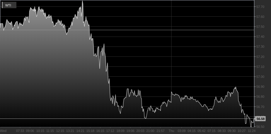 Più evidente, invece, la frenata del prezzo del petrolio WTI, in calo di circa 0,30 punti percentuali su quota 56,58 dollari al barile.