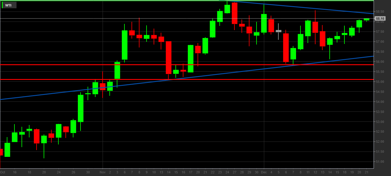 Il prezzo del petrolio è sempre più vicino al massimo annuale a 59,29$ registrato il 3 gennaio, ma anche al più recente 59,05$ del 24 novembre.