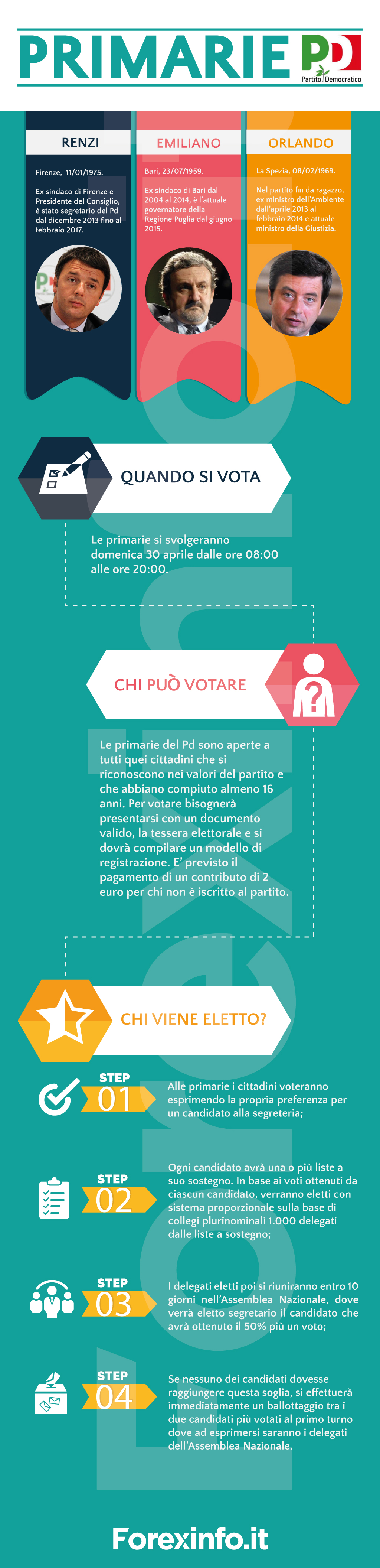 Primarie Pd: ecco i candidati, il regolamento e le modalità di voto il tutto raccolto in un’infografica.