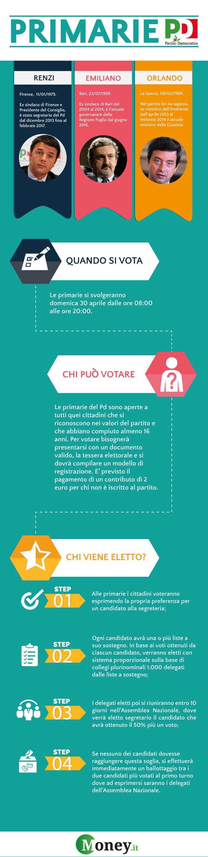 Saranno tre i candidati che si andranno a sfidare: Matteo Renzi, Andrea Orlando e Michele Emiliano. Chi al primo turno dovesse ottenere più del 50% dei voti sarà il nuovo segretario del Partito Democratico, altrimenti ci sarà un ballottaggio durante l’Assemblea Nazionale tra i due candidati più votati al primo turno.