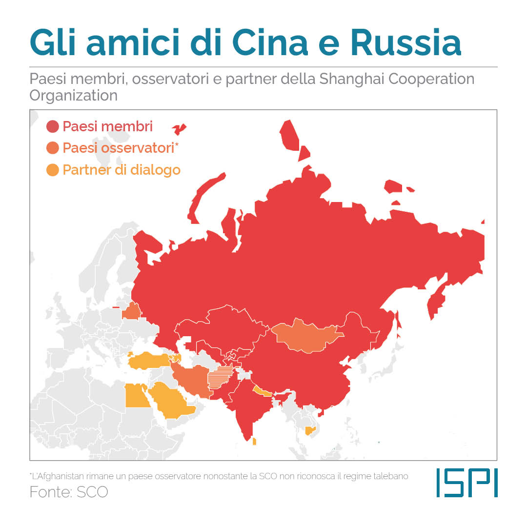 C’è un grafico Ispi molto interessante per mostrare l’influenza cinese nell’organizzazione di Shanghai e l’estensione geografica delle sue alleanze in essa rappresentate: