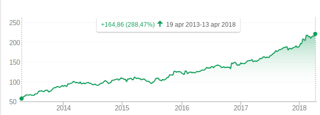 Come si può vedere, le azioni della Raytheon sono passate dai poco più di 50 dollari del 2013 agli attuali 227 dollari, il 288% in più. Soltanto nel 2017 la crescita è stata del 49%, con l’avvento alla Casa Bianca di Trump che senza dubbio ha dato una bella mano all’azienda.