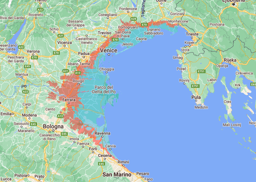 Ma non solo. Sarebbero a rischio anche le zone costiere toscane da Marina di Carrara e Livorno, superando l’entroterra di Pisa, come anche buona parte della provincia di Grosseto. Anche il Lazio non è esente, con aree a rischio inondazione da Montalto Marina fino ad abbracciare l’intera area di Fiumicino, Ostia e la costa di Ardea, fino a coinvolgere buona parte della provincia di Latina.