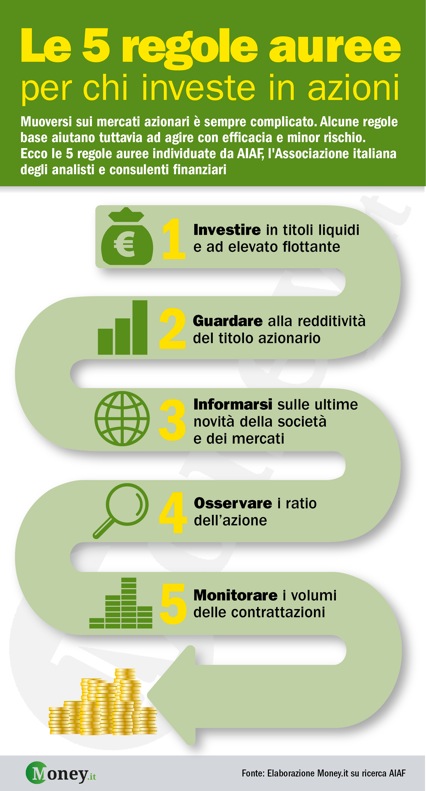Le 5 regole d’oro per chi investe in azioni, che abbiamo racchiuso in un’infografica, vanno dal consiglio di investire il proprio denaro in titoli ad ampio flottante ad elevata liquidità, al controllo della redditività del titolo azionario oggetto dell’investimento facendo molta attenzione al rendimento sul listino; dall’importanza dell’informazione e quindi della lettura degli organi di stampa e anche l’approfondimento costante sull’attività delle singole società prese in considerazione, al controllo del rapporto tra il prezzo di mercato e l’utile dell’azione. Ultimo, ma non per importanza, il consiglio di tenere sempre d’occhio i volumi delle contrattazioni e valutare le quantità trattate e i conseguenti impatti.