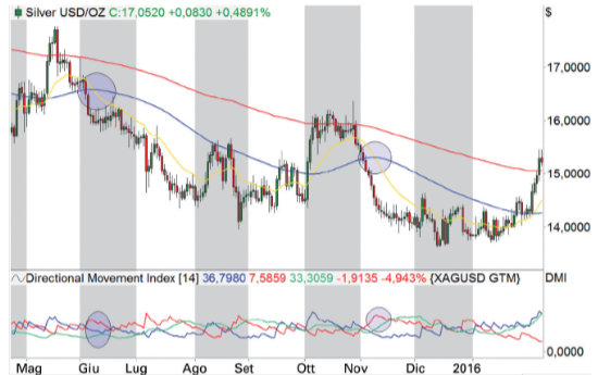 La figura 1 mostra gli indicatori nel grafico, quindi la strategia è completa: (EMA (20) in giallo, EMA (50) in blu, EMA (200) in rosso, la linea ADX in verde con il +DI in blu e il -DI in rosso). Questo è un grafico giornaliero dell’argento. Puoi vedere che mentre il prezzo rimane sotto l’EMA (200), sono significative solo posizioni di vendita. Noi non vogliamo vendere solo in base a questo, ma solo se gli altri indicatori supportano lo scenario. Questi sono i casi, nei cerchi blu.