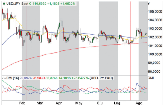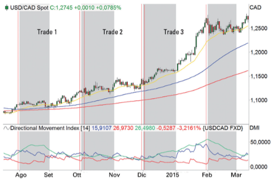 In aggiunta all’EMA (200), usiamo altri indicatori: l’EMA (20), l’EMA (50) e l’indicatore direzionale di media (Average Directional Index), in breve ADX, con 14 periodi. Una tendenza è particolarmente forte quando l’ADX (14) è sopra i 30. L’ADX risale al concetto di movimento direzionale di Welles Wilder ed è la versione smorzata dell’Indice di Movimento Direzionale calcolato dagli indicatori parziali +DI e -DI. +DI e -DI determinano la direzione della tendenza, l’ADX la forza della tendenza (vedi il riquadro).
