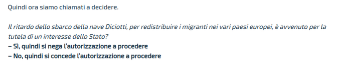Ha fatto molto discutere come agli attivisti certificati è stato posto il quesito online. Votando Sì infatti ci si sono espressi contro l’autorizzazione a procedere nei confronti di Matteo Salvini, votando No invece a favore.