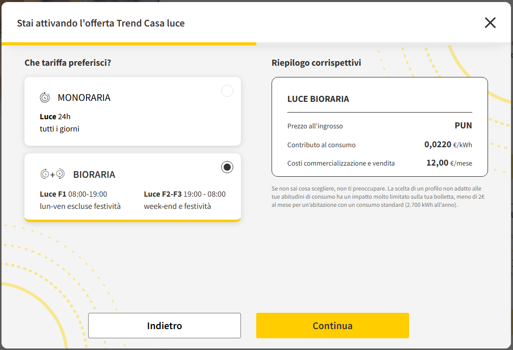 Di fatto, chi ritiene di consumare perlopiù nella fascia oraria serale e nei weekend, ad esempio se per larga parte del giorno è fuori casa, allora dovrebbe propendere per la bioraria, altrimenti è la monoraria la più conveniente.