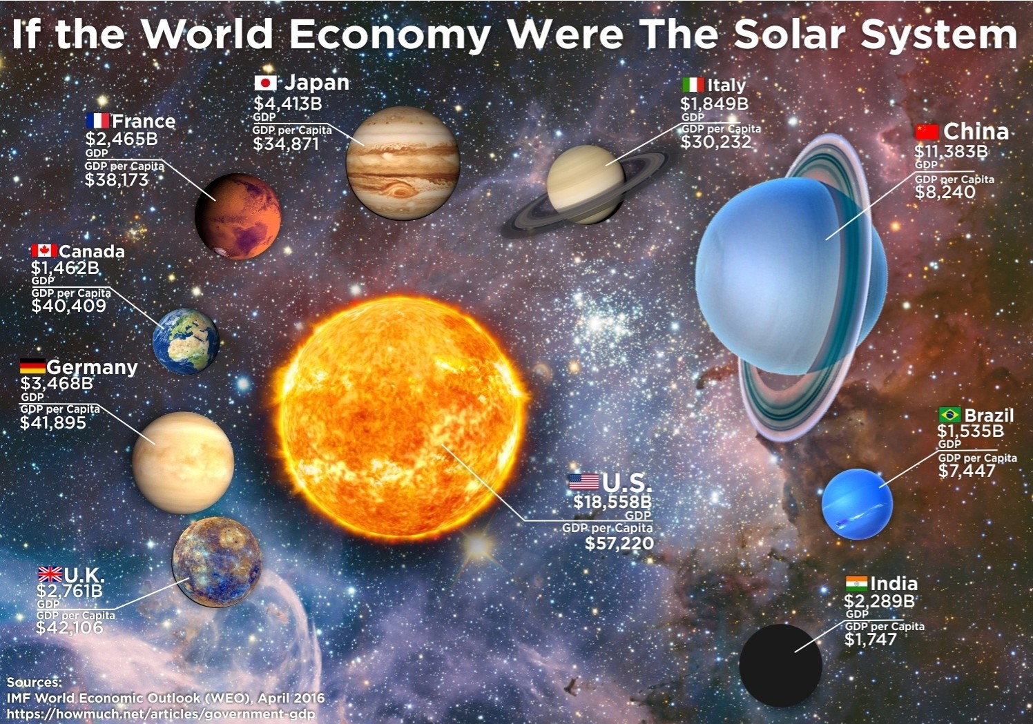 E se l’economia mondiale fosse il sistema solare? Ecco come apparirebbe