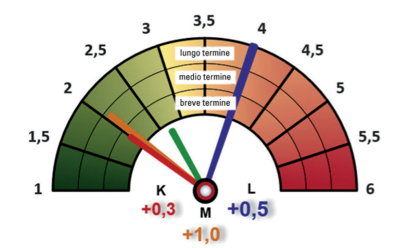 In media, otteniamo un trend completamente accettabile e di qualità “2.7” (“appena buono”). Questo viene indicato dall’ago verde. I numeri colorati attorno al centro del barometro indicano il cambiamento nel rispettivo ago al periodo precedente. Quindi, per esempio, l’ago blu è recentemente migliorato (lungo termine) nel confronto mensile di 0.5 punti, da 4.5 a 4.0. L’ago arancione mostrato nella settimana precedente mantiene ancora un valore di 3.1 e da allora è migliorato di circa 1.0 a 2.1.