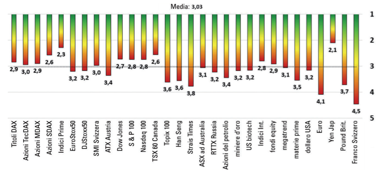 di fine maggio/inizio giugno? La valutazione complessiva sulla qualità del trend dei mercati internazionali ha una media di 3.03 (medio). Questo corrisponde a “soddisfacente”. Questo è leggermente migliore della media complessiva – cioè 3.5. Questo valore è infatti matematicamente lontano sia da “ottimo” (1.0) che da “insufficiente” (6.0).