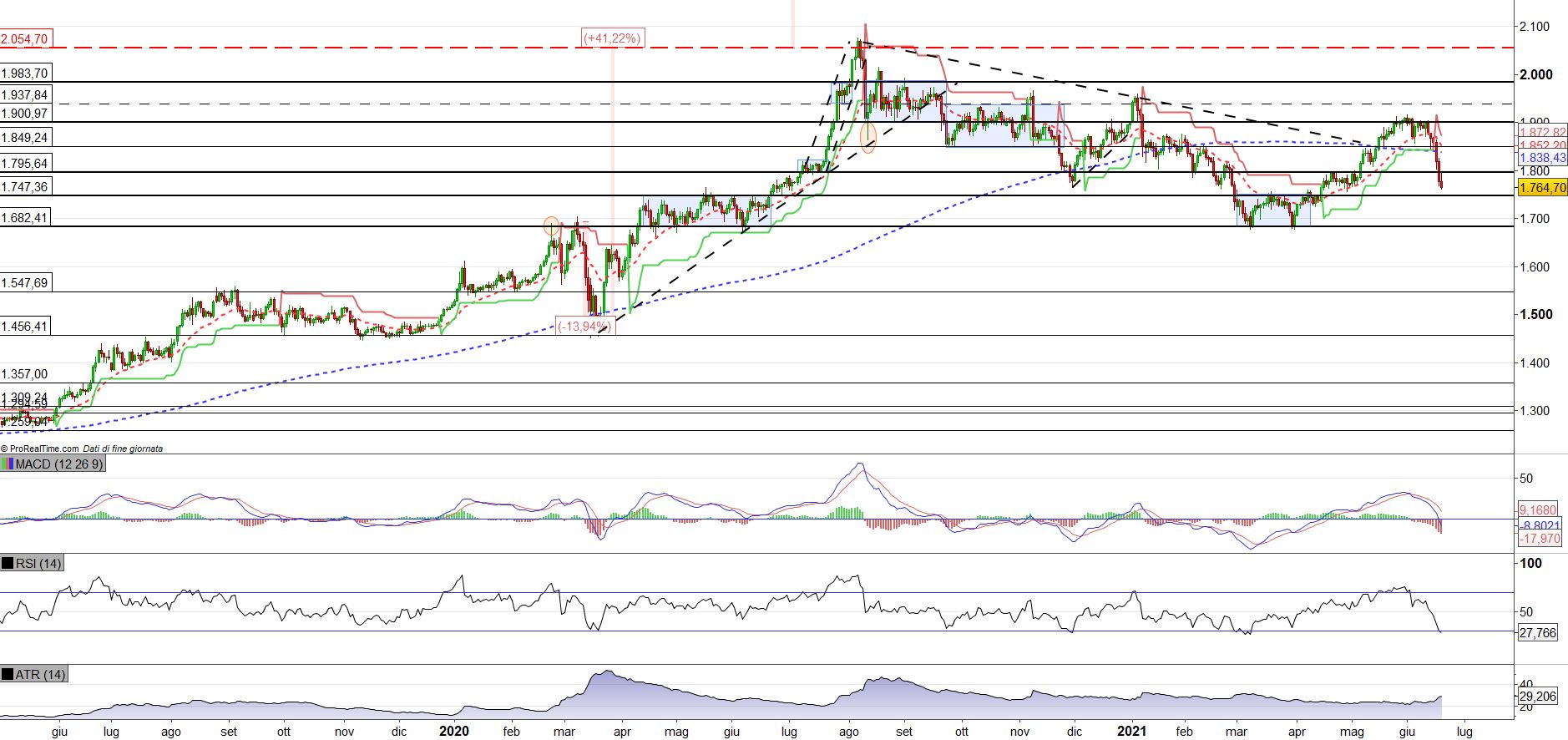 Il gold crolla dopo il test della resistenza in area 1.900$ e inverte la tendenza positiva di breve termine. Dopo un forte pressing sul livello, i venditori prendono il sopravvento del mercato e portano il lingotto sui livelli di prezzo di metà di aprile 2021. Ad oggi l’impostazione è decisamente negativa, ma la repentina velocità di flessione potrebbe lasciare spazio ad un pullback. Le possibili zone di rimbalzo si potrebbero evidenziare nei supporti a quota 1.750$ o 1.680$, anche prossimi target short.