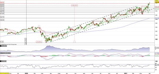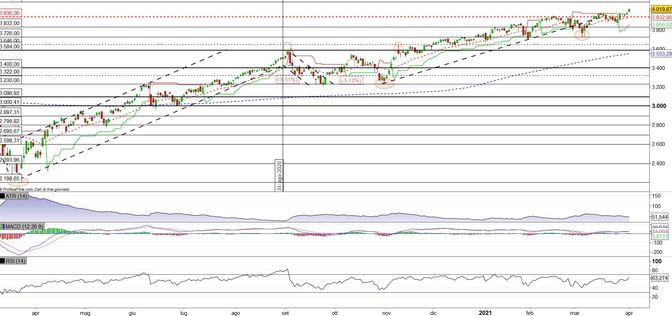 Nel Forex si sottolinea il movimento dell’EUR/JPY, verso il test della resistenza in area 130,50 e l’EUR/SEK, in ripresa e al confronto con il passaggio della EMA(200). Il Cable (GBP/USD) cerca di reagire dopo il ritracciamento in area 1,3830, ma il trend negativo di breve termine, avviato con la Pin Bar Reversal del 24 marzo 2021, non sembra arrestarsi. L’USD/JPY prosegue la corsa rialzista.