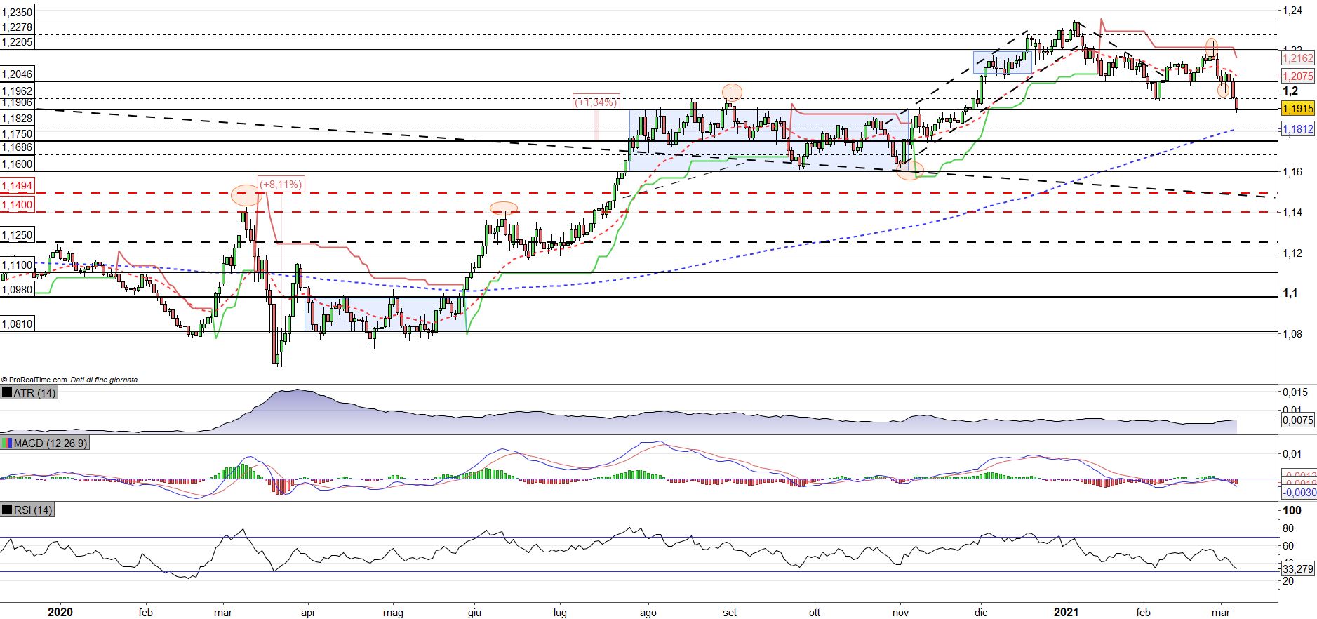 Una rottura dell’area di prezzo attuale potrebbe condurre il cambio verso il test dell’area a 1,1830, zona probabile di passaggio della SMA(200), media mobile semplice di lungo termine. Un recupero sopra quota 1,2050 potrebbe lasciare spazio ad un cambio di tendenza. L’impostazione tecnica di breve appare per il momento negativa.