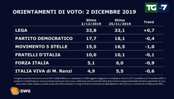Nel marasma degli ultimi giorni, ci sono due fattori che sembrerebbero aver condizionato il responso del sondaggio politico realizzato, per conto del Tg la7 di Enrico Mentana, dall’istituto Swg in data 2 dicembre.