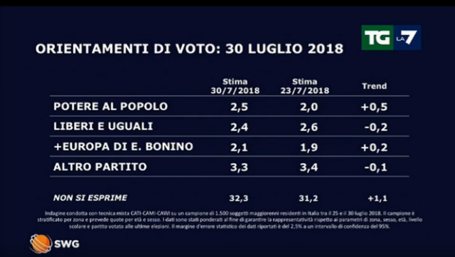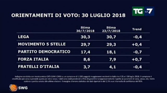 Questo è il responso del consueto sondaggio politico che l’istituto SWG ha realizzato, nel periodo compreso tra il 25 e 30 luglio, per l’edizione serale del TG La7 di Enrico Mentana.