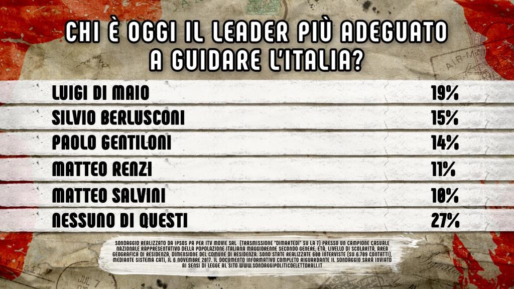 Con il 19% dei voti, Luigi Di Maio del Movimento 5 Stelle risulta essere il leader più adeguato per l’Italia.