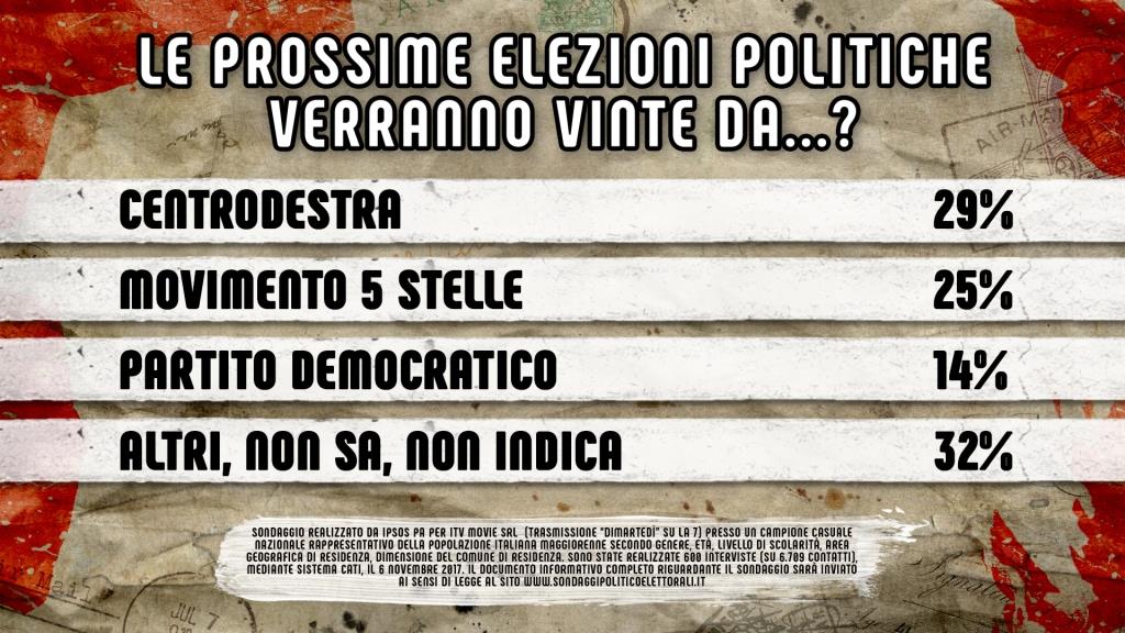 Testa a testa tra il Centrodestra (29%) e il Movimento 5 Stelle (25%), ma la percentuale più alta è quella degli indecisi (32%). Insomma, ad oggi il futuro politico dell’Italia è ancora tutto da scrivere.