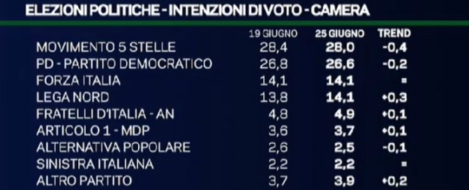 Il Movimento 5 Stelle resta in vetta, complice il calo del Partito Democratico, il vero sconfitto di questa tornata elettorale. Nel dettaglio, il PD perde lo 0,2% rispetto agli ultimi sondaggi, riducendo a 1,2% la distanza dal Movimento 5 Stelle.