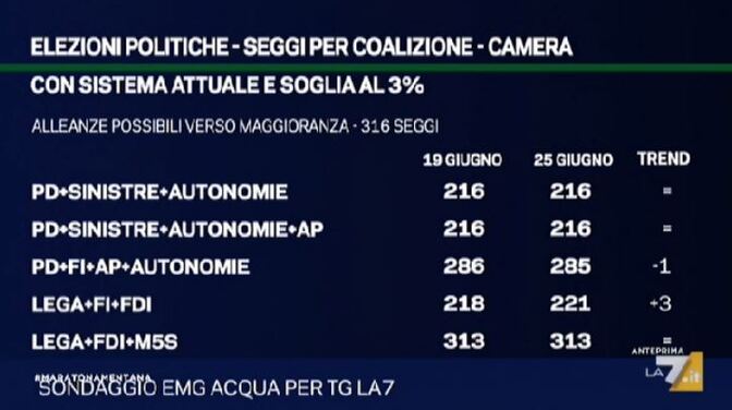 Sondaggi politici elettorali: nello speciale elezioni amministrative del TG La7, sono stati pubblicati i dati sulle intenzioni di voto alle prossime politiche rilevati dall’istituto Emg Acqua.