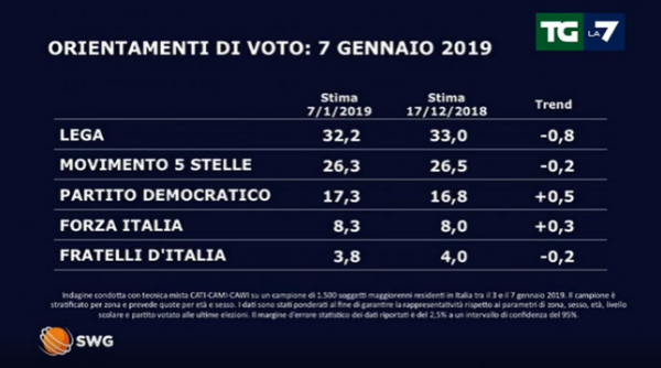 Chiusa proprio sul filo di lana la partita della legge di Bilancio è tempo di tirare le somme per i partiti. C’era attesa quindi per conoscere l’esito del primo sondaggio politico dell’anno realizzato da SWG che, settimanalmente, monitora la situazione per conto del TG La7.