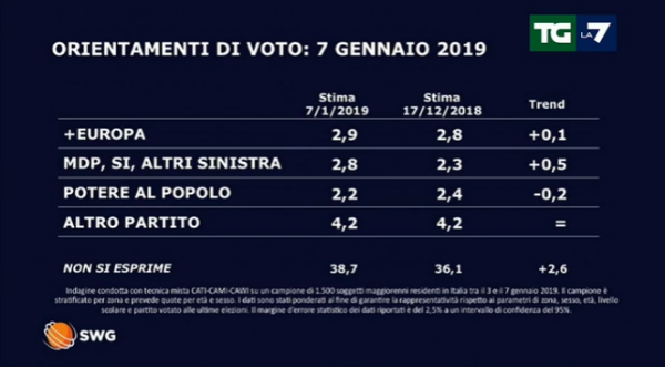 Sempre in ottica delle elezioni europee si conferma il buon momento di +Europa, ma da soli sarà difficile superare la soglia di sbarramento. Stesso discorso poi anche per la sinistra, ormai sempre più frammentata.