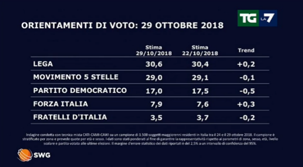 Sondaggio politico di SWG: cresce la Lega e lieve flessione per i 5 Stelle, nel complesso comunque il governo regge, male invece il Partito Democratico.
