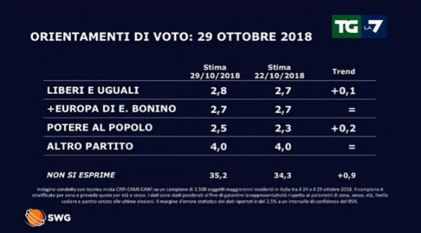 Nel centrosinistra viene dato in netto calo il Partito Democratico che, nonostante le difficoltà del governo in materia di legge di Bilancio non solo non riesce a risalire la china, ma fa registrare anche un nuovo passo indietro. Stabile invece +Europa.