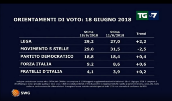 Il sondaggio quindi ha risentito sia della polemica legata ai migranti, con il caso della nave Aquarius e le tensioni con gli altri paesi dell’Unione, che della vicenda dell’arresto dell’imprenditore Luca Parnasi nell’inchiesta sulla costruzione del nuovo stadio della Roma.