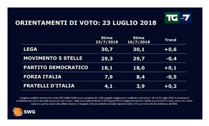 Storico risultato ottenuto dalla Lega nei sondaggi politici realizzati da SWG e andati in onda nell’edizione serale del Tg La7 di lunedì 23 luglio.