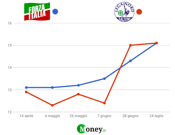 Come possiamo vedere dai sondaggi politici di oggi, a Forza Italia e Lega Nord ad oggi converrebbe presentarsi uniti in un listone di Centrodestra (insieme a Fratelli d’Italia) perché in questo modo - grazie alla crisi del Movimento 5 Stelle e del Partito Democratico - sarebbe la prima forza politica del Paese (35,1%).
