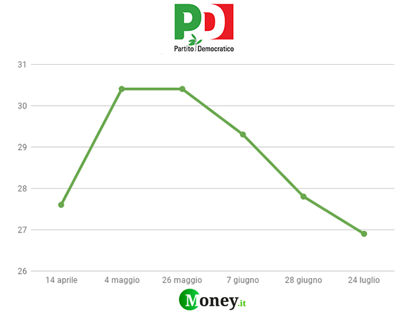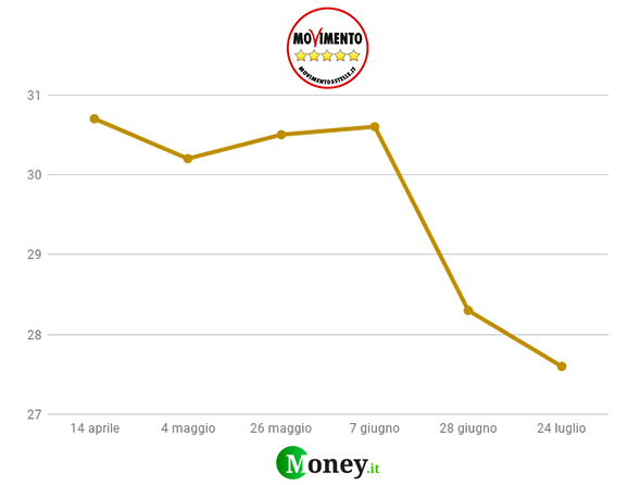 Anche se in difficoltà il Movimento 5 Stelle si conferma la prima forza politica del Paese, con una percentuale pari al 27,6%. Ma se guardiamo ai mesi scorsi non si può negare che il M5S sia in leggera crisi, dal momento che in soli 3 mesi c’è stato un calo di 2,9 punti percentuali.