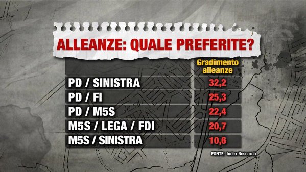 Ecco perché allora vale la pena soffermarsi sui dati snocciolati da Index Research durante il programma di Corrado Formigli, con l’alleanza tra il Partito Democratico e la Sinistra che sarebbe l’accordo preferito da parte degli elettori italiani.