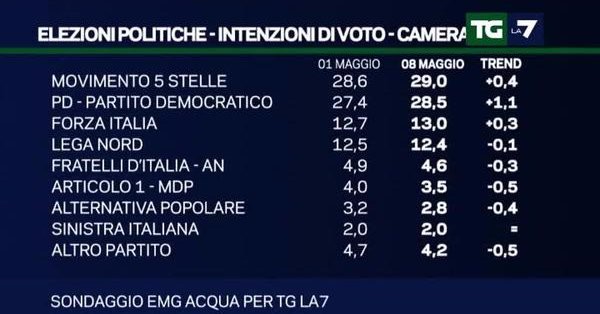 Questa è la fotografia fornita dal settimanale sondaggio politico elettorale realizzato dall’istituto EMG Acqua per conto del TG La7 di Enrico Mentana, che indica la situazione dopo i risultati delle elezioni in Francia di domenica 7 maggio.