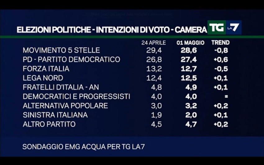 Questa è la fotografia fornita dal settimanale sondaggio politico elettorale realizzato dall’istituto EMG Acqua per conto del TG La7 di Enrico Mentana, che indica la situazione dopo le primarie PD che si sono svolte domenica 30 aprile.