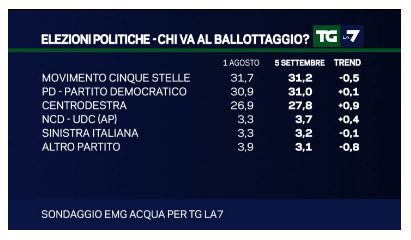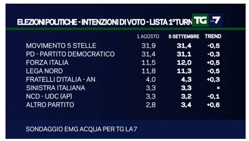 Nei sondaggi politici Emg Acqua viene dato ampio spazio anche alle intenzioni di voto degli italiani su Movimento 5 Stelle, Partito Democratico e Centrodestra. È interessante notare come in questo mese Forza Italia sia riuscita a superare la Lega Nord, complice un periodo di appannamento di Matteo Salvini.