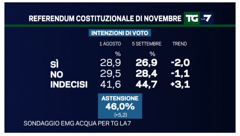 Al momento il No è in vantaggio sul Sì, almeno secondo quanto rilevato dai sondaggi politici Emg Acqua trasmessi nel corso dell’ultima puntata del TG La7. Nel dettaglio, la percentuale del No è pari al 28,4% (-1,1%), mentre quella del Sì al 26,9% (-2,0%).