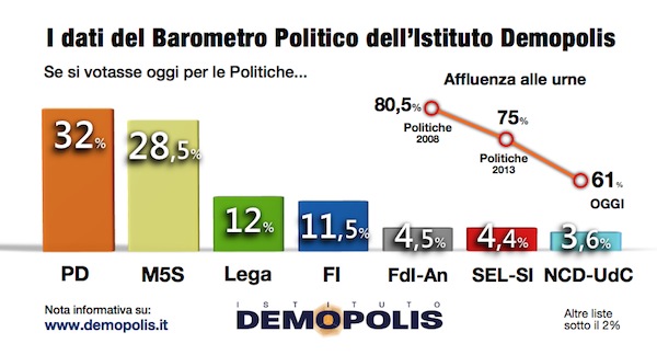Secondo i sondaggi elettorali di Demopolis, il Partito Democratico è la prima forza politica italiana, poiché se si votasse oggi otterrebbe il 32% delle preferenze.