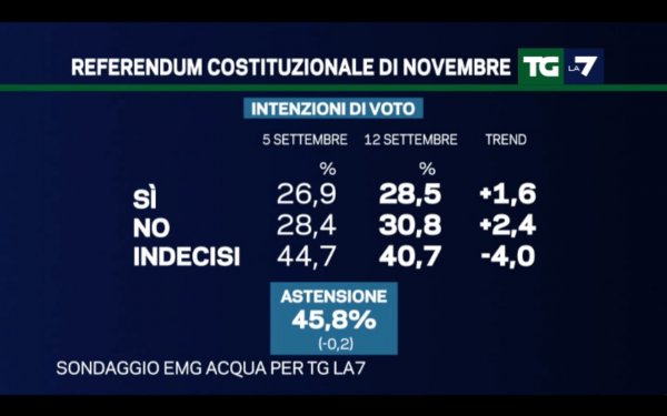 Nei sondaggi politici dell’istituto Demopolis non viene dato spazio al referendum costituzionale. In questo caso però possiamo analizzare i dati forniti da Emg Acqua nei sondaggi politici per il Tg La7.