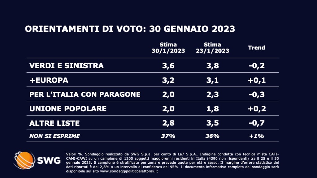 Sarebbe oltre la soglia invece +Europa, mentre appare in salute anche Unione Popolare di Luigi de Magistris che potrebbe sfruttare il fatto di aver presentato propri candidati sia alle regionali in Lombardia sia nel Lazio, dove per i sondaggi non sarebbe distante dal 3%.