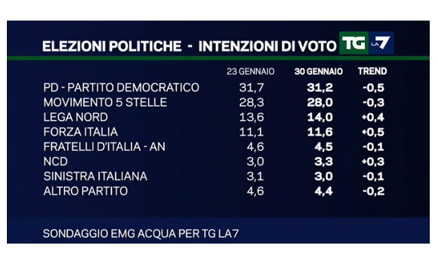 Anche il Movimento 5 Stelle, dopo la notizia per cui la Raggi è indagata, ha perso lo 0,3% dei consensi. Crescono invece sia la Lega Nord che Forza Italia, che a questo punto potrebbero riconsiderare l’ipotesi di presentarsi insieme alle prossime elezioni politiche. Infatti, una coalizione di Centrodestra che include anche Fratelli d’Italia potrebbe ottenere circa il 30% dei voti, più del Movimento 5 Stelle.