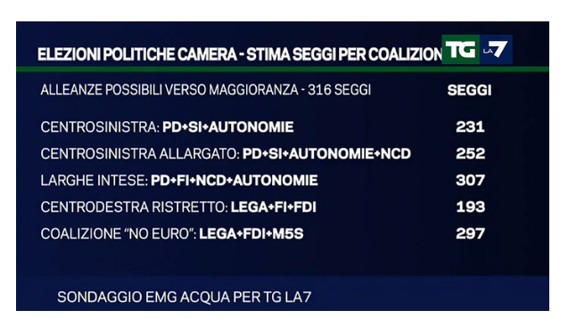 Gli scenari rilevati dai sondaggi politici Emg Acqua sono più che allarmanti; infatti, se si votasse oggi il Paese sarebbe ingovernabile poiché nessuna forza politica, né tantomeno una coalizione, avrebbe la maggioranza dei 316 seggi alla Camera dei Deputati. Neppure un nuovo governo delle larghe intese, ci riuscirebbe.