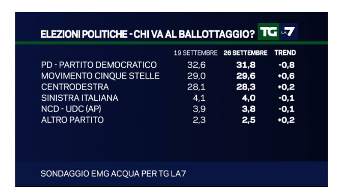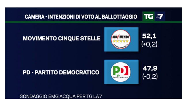 Ad un eventuale ballottaggio il Movimento 5 Stelle avrebbe la meglio sia del PD che dello schieramento del Centrodestra. Renzi quindi deve sperare che il suo partito sfidi al ballottaggio lo schieramento di Centrodestra, poiché secondo i sondaggi politici Emg Acqua avrebbe delle ottime possibilità di vincere.