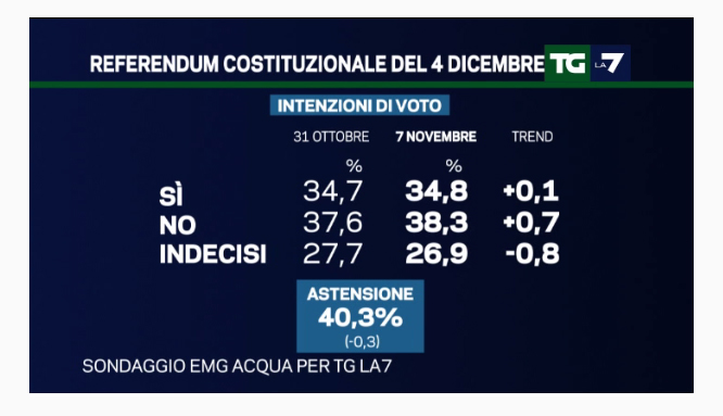 Emg, Istituto di Statistica che ogni lunedì pubblica dei sondaggi sul referendum durante l’edizione serale del Tg La7 ha rilevato una percentuale ancora molto alta di indecisi, pari al 26,9%. Gli astenuti, invece, dovrebbero essere circa il 40% degli aventi diritto.