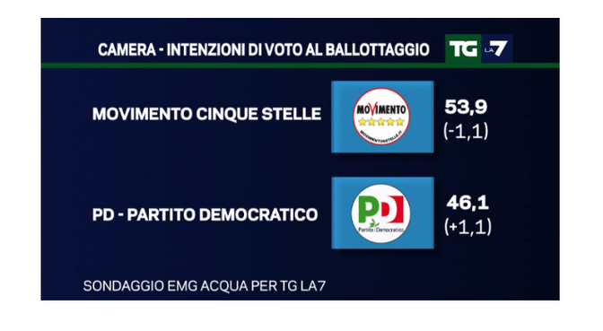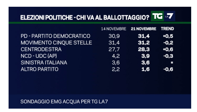 Gli ultimi dati risalgono ai sondaggi politici elettorali condotti da EMG Acqua, per il Tg La7 condotto da Mentana. Fino alla scorsa settimana c’è stato uno spazio dedicato ai sondaggi sul referendum, ma con l’inizio del silenzio elettorale sono state analizzate esclusivamente le intenzioni di voto su Movimento 5 Stelle, Partito Democratico e Centrodestra.
