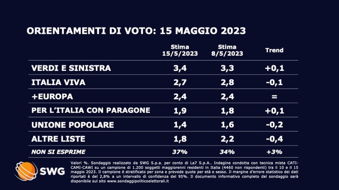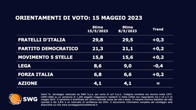 L’ultimo sondaggio politico di Swg - realizzato per contro del Tg La7 in data 15 maggio - è stato diffuso nel pieno svolgimento dello spoglio del primo turno delle elezioni amministrative, il primo vero scontro elettorale tra la presidente del Consiglio Giorgia Meloni ed Elly Schlein, sua principale antagonista da quando è diventata segretaria del Partito Democratico.