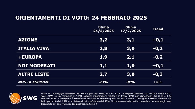 L’ultimo sondaggio politico di Swg - reso noto in data 24 febbraio dal Tg La7 di Enrico Mentana - è arrivato in contemporanea con i risultati delle elezioni in Germania che hanno incoronato Friedrich Merz come certo prossimo cancelliere, oltre a ricorrere nel terzo anniversario dello scoppio della guerra in Ucraina.