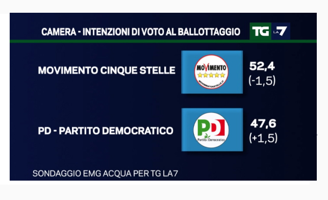 Tuttavia, per il Movimento 5 Stelle c’è stato un preoccupante calo dell’1,5% nello scontro con il PD, e anche nel confronto con il Centrodestra ha perso un punto percentuale.